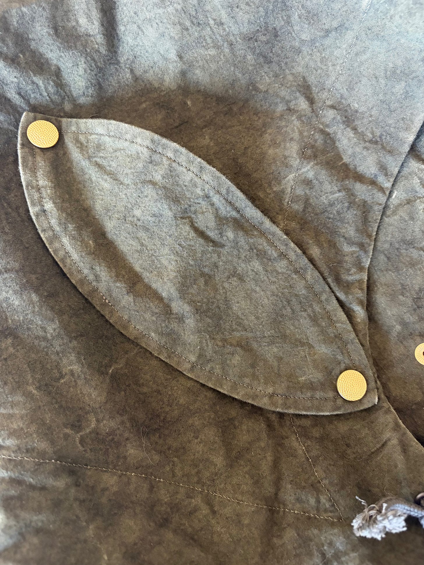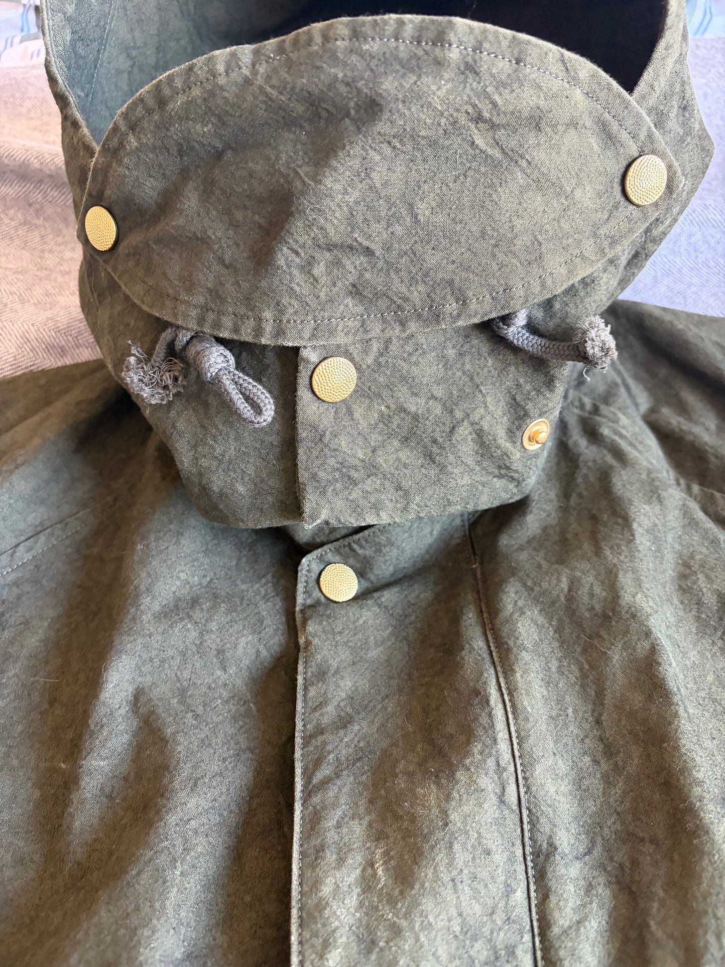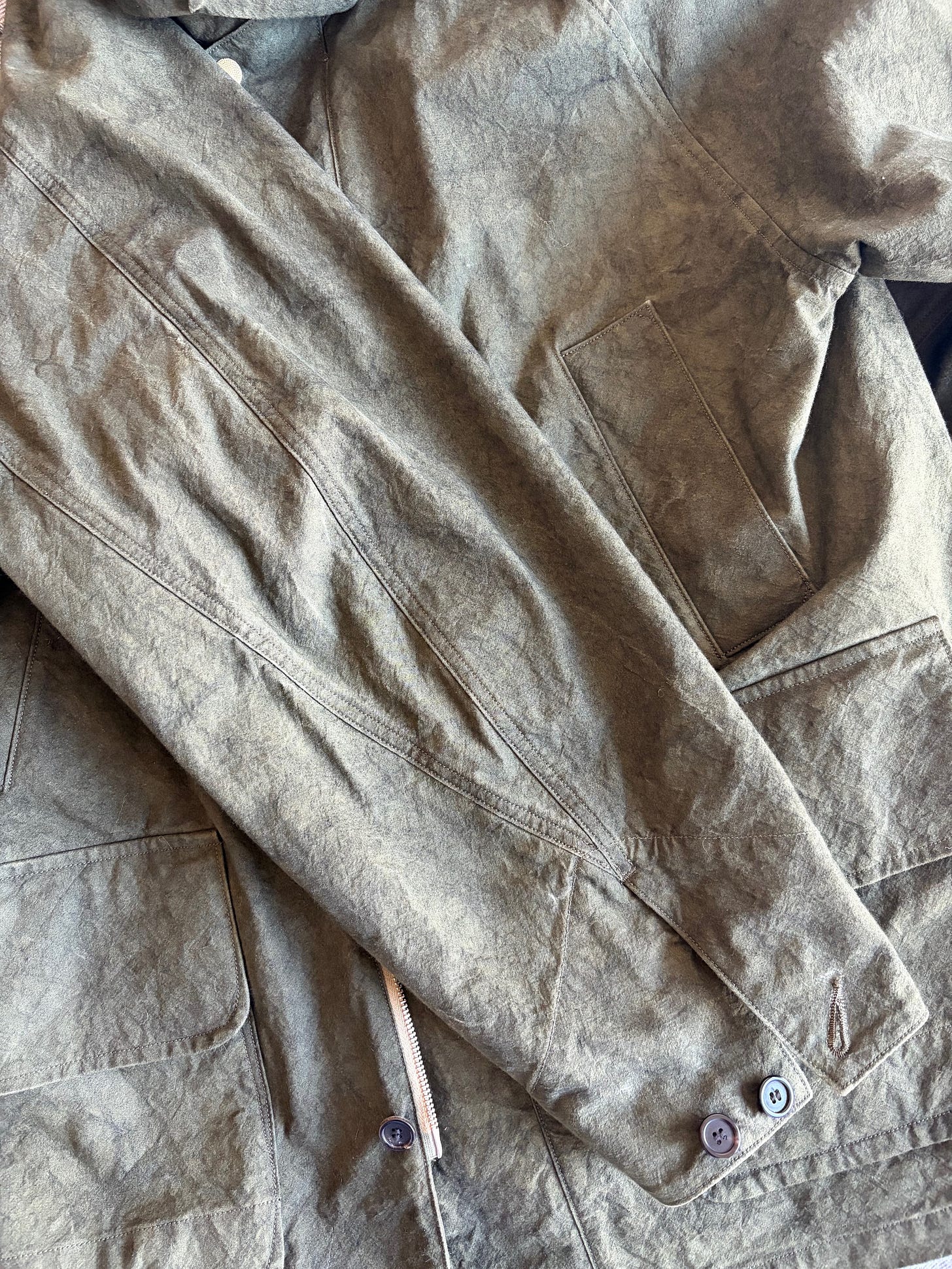J’ai passé 2000 mots et je n’ai toujours pas évoqué la veste de chasse Niceness. J’y viens. Le designer de Niceness, dont le nom ressemble à Yugioh, doit aussi peu apprécier le coton waxé que moi car il a décidé de s’en passer. De s’en passer oui, mais pas de sacrifier pour autant l’aspect visuel ni même l’imperméabilité (relative, le coton ciré n’est pas non plus ultra imperméable.) Il a donc conçu une toile de coton fortement retordue, à haute densité, qui subit divers traitements afin que la faire rétrécir et ainsi acquérir une patine (les rageux diront abîmée, mais ça fait tout le charme de la matière.) Le résultat conserve un niveau correct d’imperméabilité (loin d’une sape technique mais suffisante pour un usage quotidien standard), protège très bien du vent (c’est important pour une telle couche) et a une allure assez dingue. J’ai pris un peu de pluie, un peu de froid, un peu de vent, un peu de soleil, et je n’ai rien à dire sur les “performances” de la matière, en étant cependant peu exigeant par nature (je ne suis pas du genre à sortir sous un déluge pour le seul plaisir de tester une veste.) Notez qu’elle est juste impossible à photographier correctement, aussi voici le visuel le plus “représentatif” que j’ai pu trouver sur internet niveau teinte (pour une raison mystérieuse que les photographes m’expliqueront en commentaire, la veste est totalement verte mais rend souvent grise en photo) :