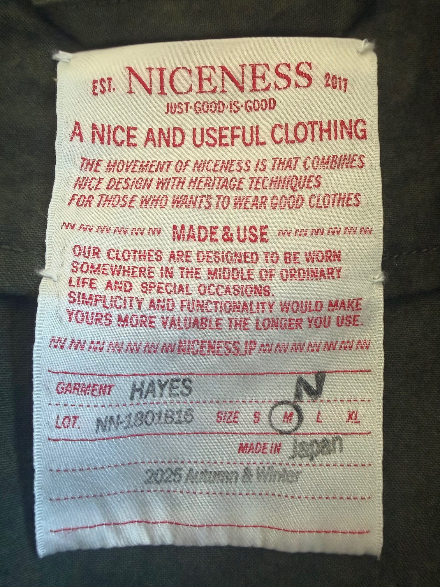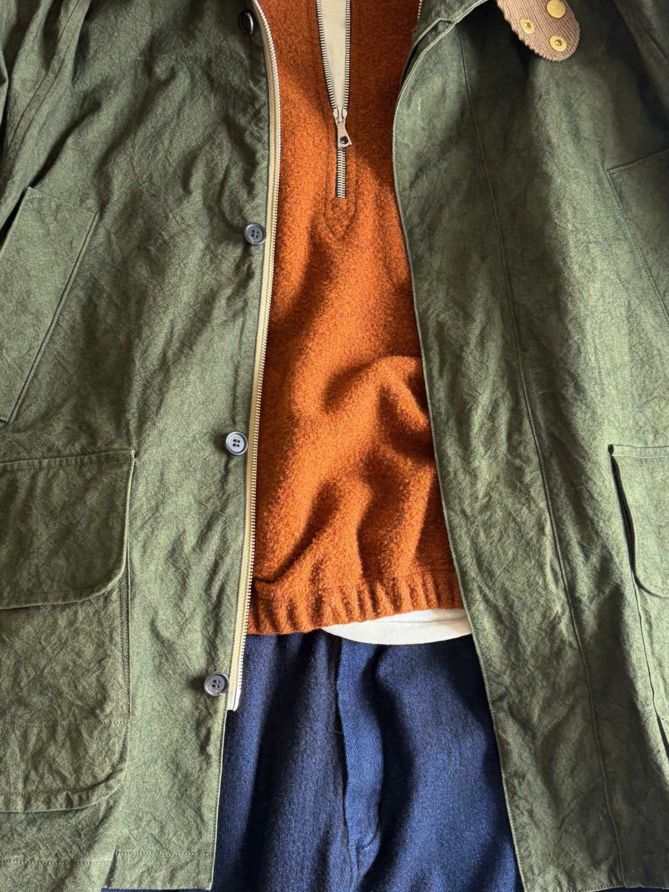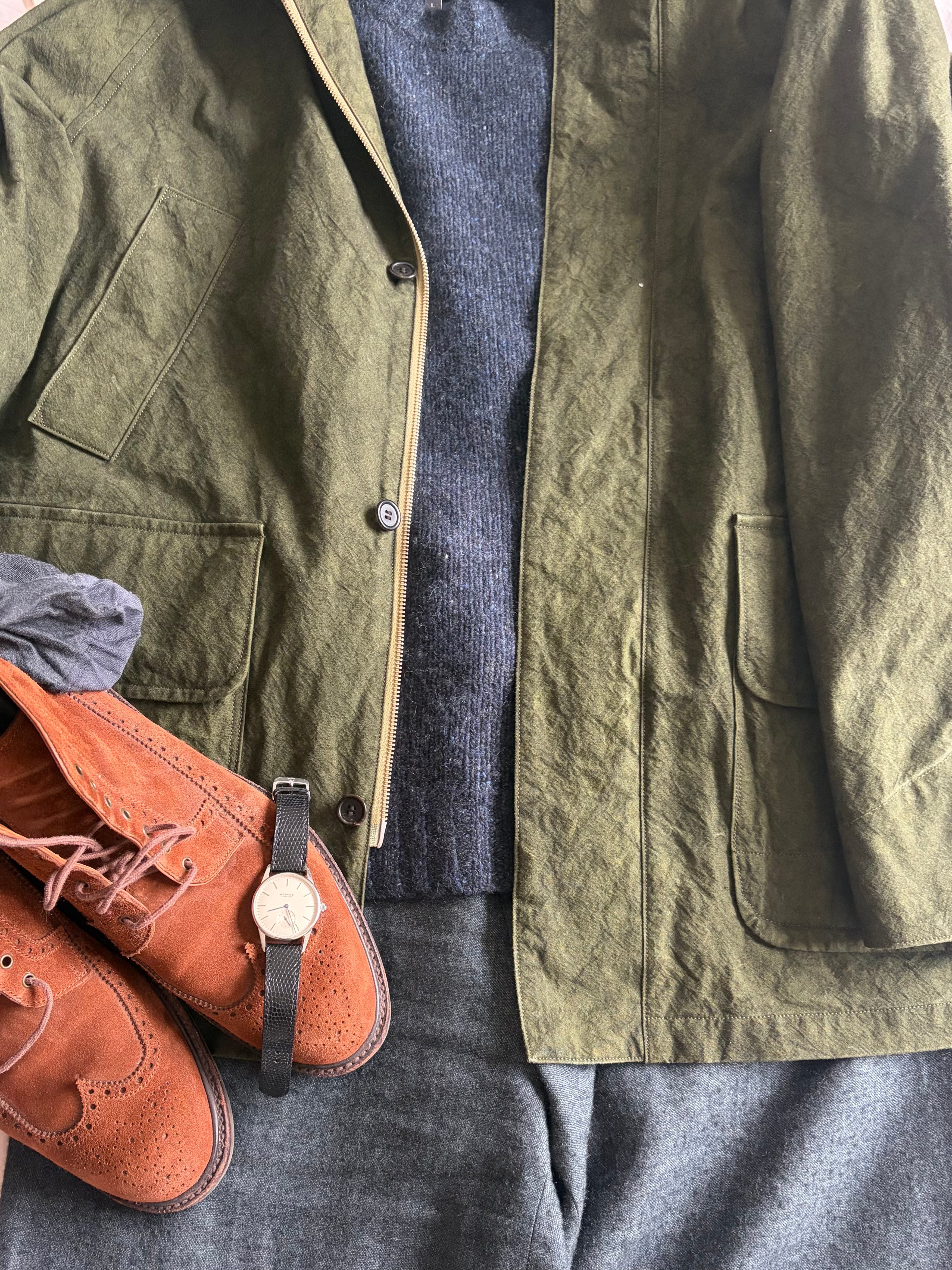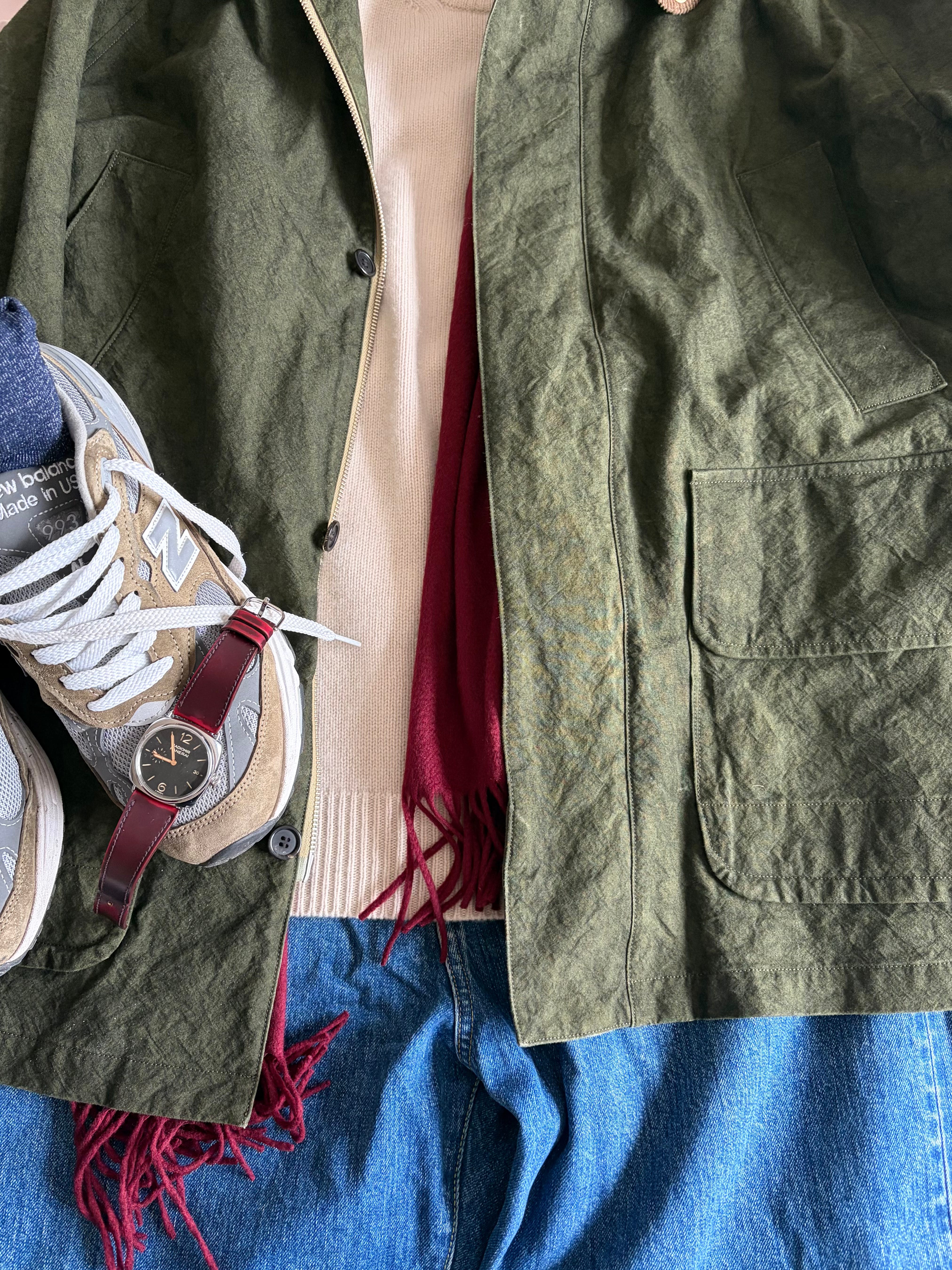 J’ai déjà parlé de Niceness, une marque japonaise franchement niche (elle est seulement dans le radar de Duchump, il faut donc en profiter avant que les influenceurs plus mainstream comme Jake Woolf ou Blackbird Skyplane ne tombent dessus), à peine distribuée hors de l’archipel, qu’on pourrait décrire comme un Auralee (pour les matières développées spécifiquement) qui ferait un enfant avec Kaptain Sunshine (pour la réinterprétation très libre de pièces vintage, assez libre pour ne pas être considéré comme repro ou même hommage), enfant élevé par Maatee and Sons (pour le côté plus foutraque des collections.) Dans mon article, je disais avoir flashé sur leur veste de chasse, et, une belle vente plus tard (ma parka Ten-C + son liner), la veste était importée du Japon.