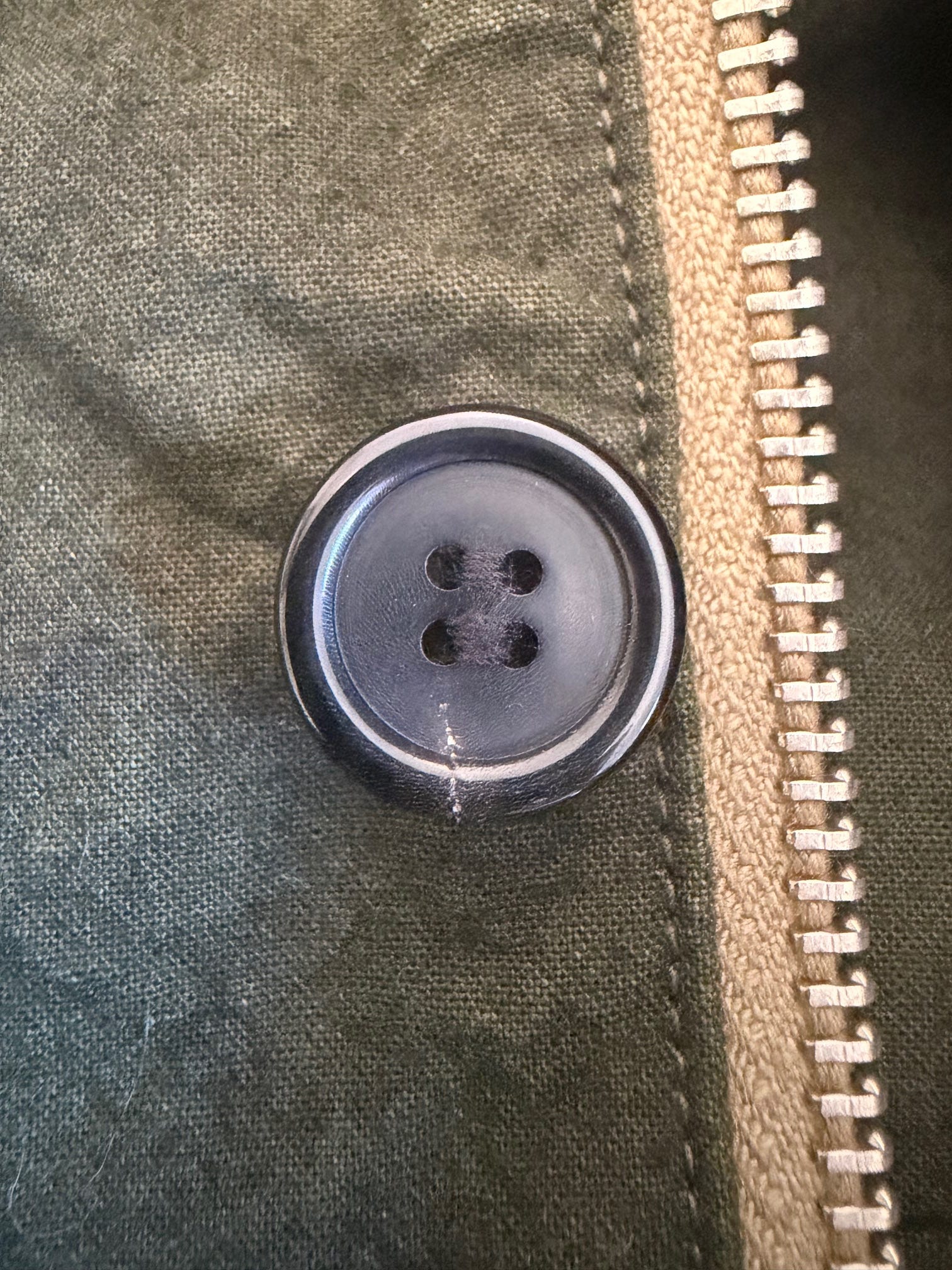 La veste comprend deux poches poitrine doublées en flanelle de coton, toujours agréable, et deux poches ventrales double entrées, petit luxe qu’on apprécie. Il lui manque toutefois une poche interne, c’est le défaut récurrent des japonais ça. Rien à faire, les poches internes ils kiffent pas. Faut dire qu’au Japon vous pouvez laisser votre iPhone et votre Rolex sur la table, revenir six heures plus tard et les retrouver tels quels. Chiant quand même. J’en ferai sans doute ajouter une cet été, pour le coup c’est possible car la veste n’est pas doublée. Le plus important, c’est le confort de placement des mains, en position haute comme basse, et la qualité de l’accessibilité aux poches à rabat, qui sont excellentes. Je passe sur le double zip, lui aussi custom, très quali. Pour le coup je l’ai rarement utilisé en mode double, comme quoi ce n’est pas toujours nécessaire. On apprécie quand même. La gorge est doublée par des boutons en corne, ce qui est plus cool que les pressions de barbour.