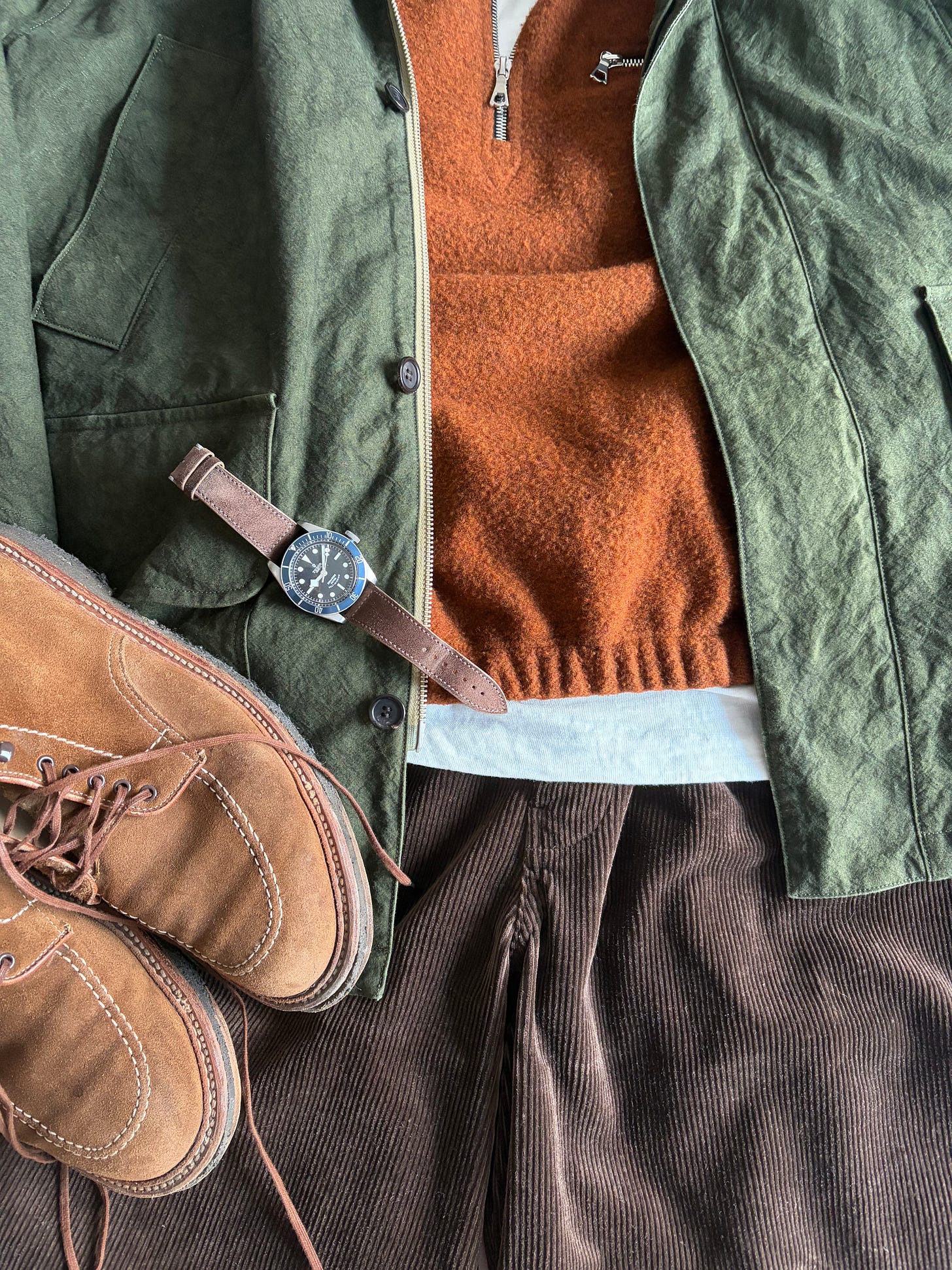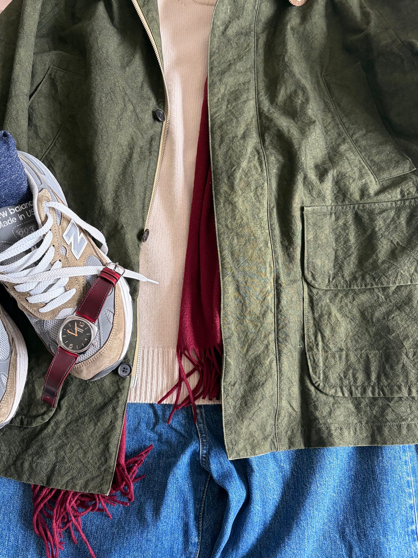 Un rapide mot sur le style pour conclure : l’usage n’est pas tout à fait celui d’une veste Barbour, car l’immense majorité de celles que vous voyez dans les lookbooks ou dans la rue sont neuves ou quasi neuves. C’est le drame des vêtements à patiner : nous sommes bien peu à avoir la constance et le faible vestiaire qui permettent d’acquérir une belle patine nous-même. Donc ces tenues très ivy avec des mocs, un jean brut pas délavé, un shetland pas usé et une Bedale toute lisse et brillante, elles ne sont pas optimales avec cette veste Niceness, donc l’aspect usé équivaut plutôt à une Barbour vintage qui aurait reçu un entretien pro. La Hayes fonctionne mieux dans des tenues plus campagne anglaise, gentleman chasseur, ou alors associée dans un univers fashion bro, ce nouvel avatar de la mode masculine qui aime Evan Kinori, Dana Lee Brown, Maiden, etc. Rustique et chic pour parodier un slogan de magazine féminin. En décembre je m’étais challengé pour poster chaque matin un assemblage de ma tenue du jour, curieux de voir ce que pouvait apporter un tel exercice (spoiler : rien), et je vais donc terminer sur les tenues la comprenant :