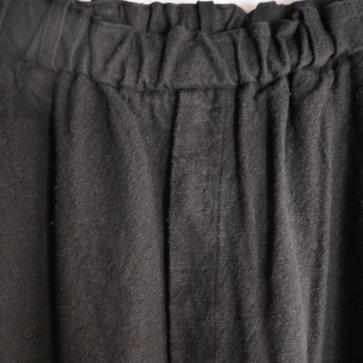 La marque excelle particulièrement dans son travail du lin/ramie/chanvres, qui sont très fibres assez proches obtenues à partir de plantes. Elle sait comment combiner chacune pour en tirer le meilleur et en minimiser les défauts, par exemple la froissabilité du lin. Ce pantalon a en plus son weft en soie, pour un coté neppy.