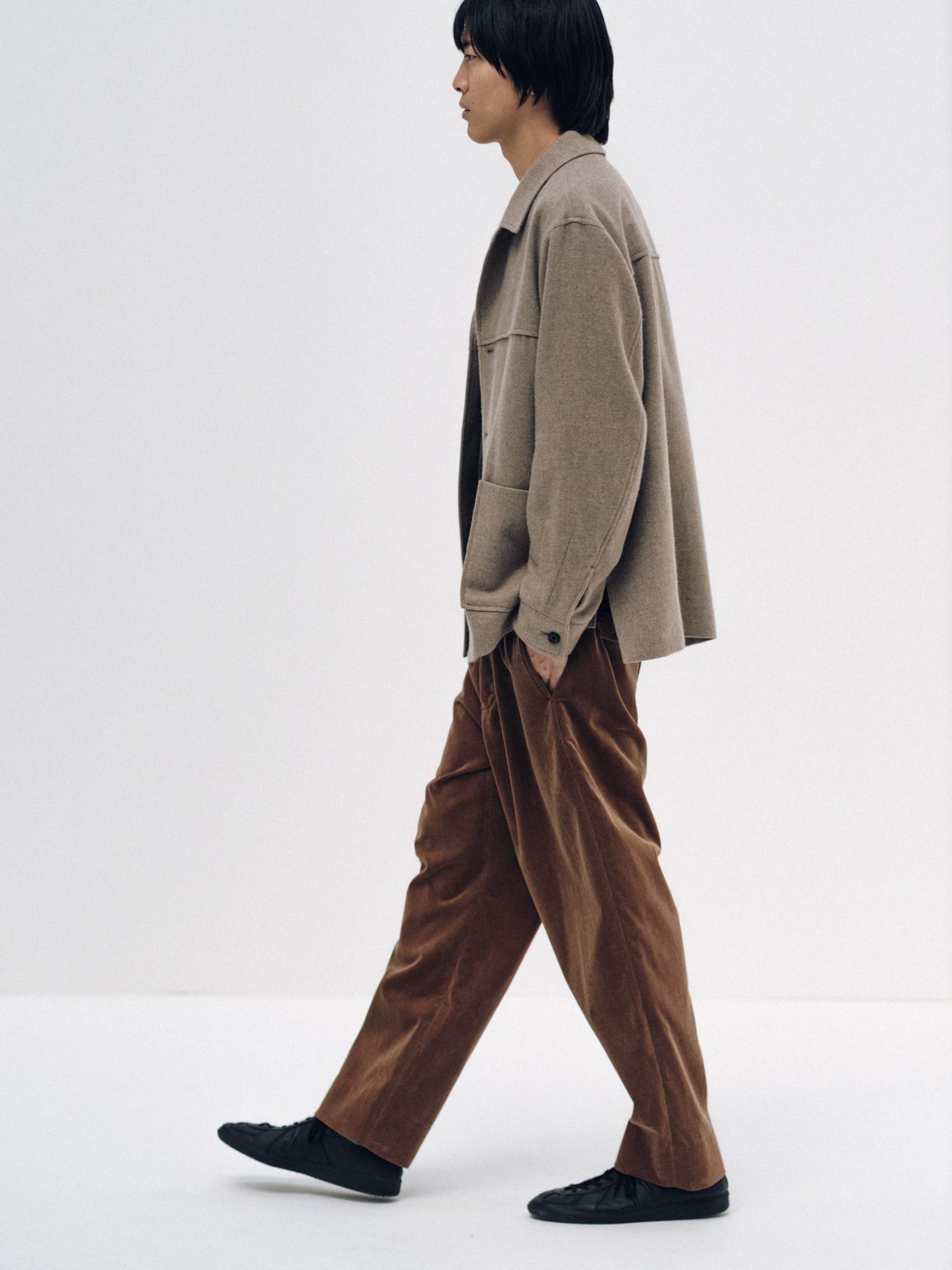 Plus minimaliste dans son approche, avec le même type de coupe loose mais sans excès, et une très belle flanelle de laine. Quand les japonais se lancent dans la flanelle 100% laine, ils vont généralement chercher le luxe, ici on est sur un super 160’s, ce que bosse Auralee en général pour vous donner une idée. On reste sur des flanelles légères, afin que ça drape bien.