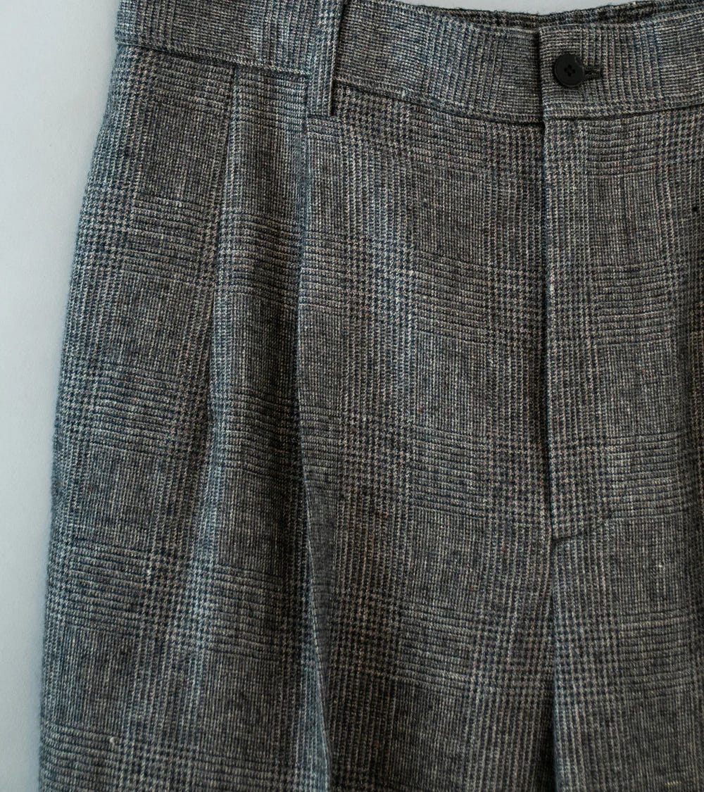 Je disais que les japonais n’hésitaient pas à faire des mélanges cool, ici la laine et le lin dans une flanelle légère et sèche de toute beauté. Trois couleurs dont ce glencheck qui m’a tout de suite séduit.